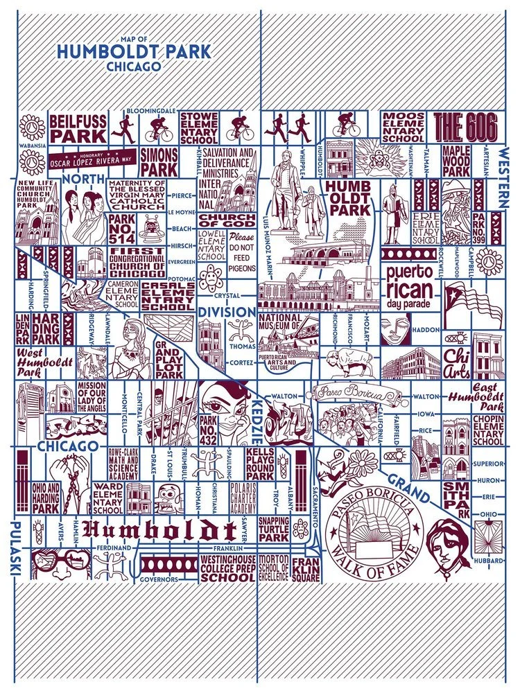 For my Chicago neighborhood maps, each area is thoroughly researched before they are created. Boundaries are determined by looking at multiple sources as well as the 77 community areas in Chicago. I begin the maps by plotting all of the streets on the illustration. Then, the major landmarks, icons and historical districts are researched for the neighborhood. This includes historical districts, significant buildings, churches, schools and parks to name a few. Next, I travel to the neighborhood to take pictures and get a better idea of what it is like to be there. As a Chicago resident for over 13 years, I know a great deal about the layout of each neighborhood. However, this part of the process makes me see things I might not have noticed before. Using the pictures I took with images I found during my research, I organize how I want everything to look on the map. Finally, everything is drawn in its place.
