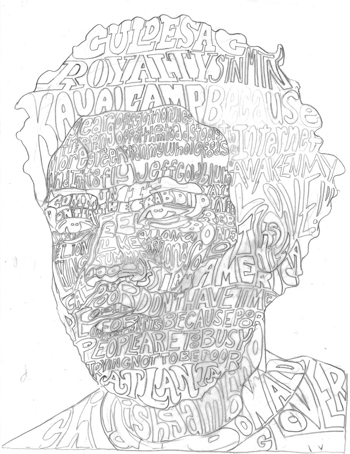 Hand lettered calligram of musician and actor Donald Glover. The typography portrait includes his mixtapes, albums, songs, movies and television shows. Quotes from Community, Sweatpants and Atlanta are also included.